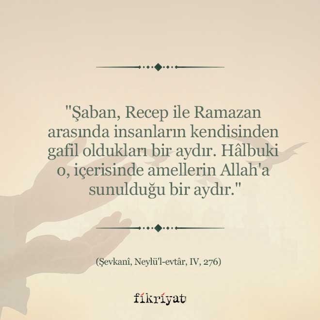 "Şaban, Recep ile Ramazan arasında insanların kendisinden gafil oldukları bir aydır. Hâlbuki o, içerisinde amellerin Allah'a sunulduğu bir aydır."