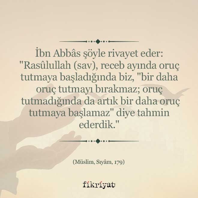 İbn Abbâs şöyle rivayet eder: "Rasûlullah (sav), receb ayında oruç tutmaya başladığında biz, "bir daha oruç tutmayı bırakmaz; oruç tutmadığında da artık bir daha oruç tutmaya başlamaz" diye tahmin ederdik."