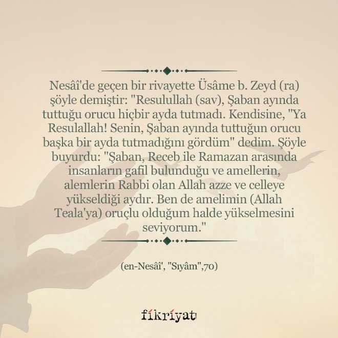 Nesâî'de geçen bir rivayette Üsâme b. Zeyd (ra) şöyle demiştir: "Resulullah (sav), Şaban ayında tuttuğu orucu hiçbir ayda tutmadı. Kendisine, "Ya Resulallah! Senin, Şaban ayında tuttuğun orucu başka bir ayda tutmadığını gördüm" dedim. Şöyle buyurdu: "Şaban, Receb ile Ramazan arasında insanların gafil bulunduğu ve amellerin, alemlerin Rabbi olan Allah azze ve celleye yükseldiği aydır. Ben de amelimin (Allah Teala'ya) oruçlu olduğum halde yükselmesini seviyorum."