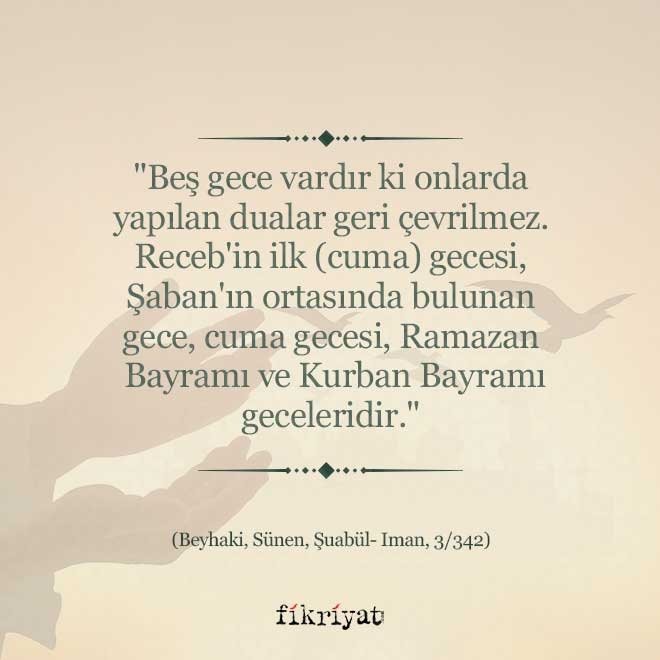 "Beş gece vardır ki onlarda yapılan dualar geri çevrilmez. Receb'in ilk (cuma) gecesi, Şaban'ın ortasında bulunan gece, cuma gecesi, Ramazan Bayramı ve Kurban Bayramı geceleridir."