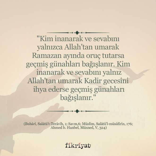 "Kim inanarak ve sevabını yalnızca Allah'tan umarak Ramazan ayında oruç tutarsa geçmiş günahları bağışlanır. Kim inanarak ve sevabını yalnız Allah'tan umarak Kadir gecesini ihya ederse geçmiş günahları bağışlanır."