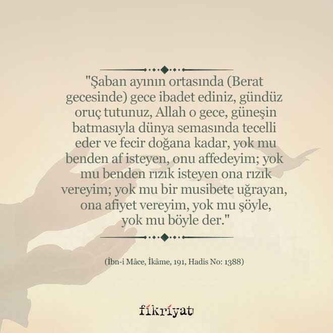 "Şaban ayının ortasında (Berat gecesinde) gece ibadet ediniz, gündüz oruç tutunuz, Allah o gece, güneşin batmasıyla dünya semasında tecelli eder ve fecir doğana kadar, yok mu benden af isteyen, onu affedeyim; yok mu benden rızık isteyen ona rızık vereyim; yok mu bir musibete uğrayan, ona afiyet vereyim, yok mu şöyle, yok mu böyle der."