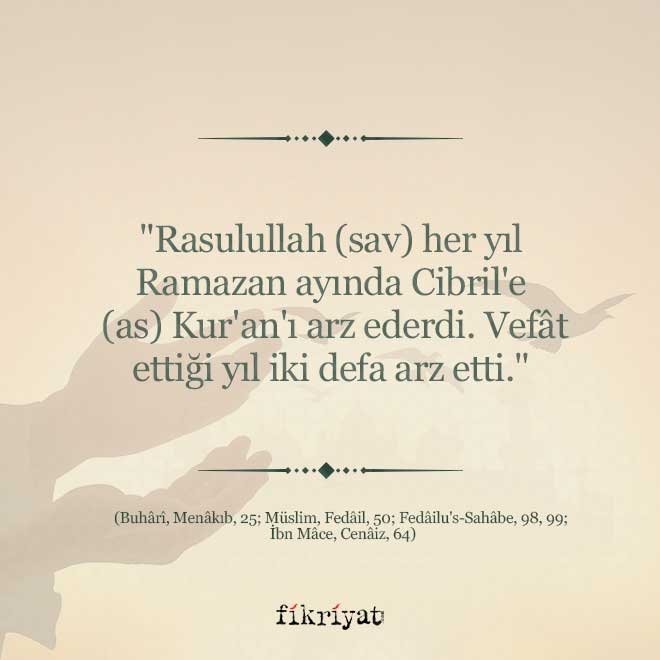 "Rasulullah (sav) her yıl Ramazan ayında Cibril'e (as) Kur'an'ı arz ederdi. Vefât ettiği yıl iki defa arz etti."