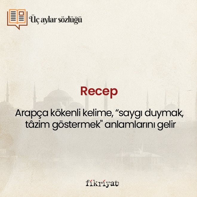 🔹 Arapça kökenli "recb" kelimesinden türeyen "recep", "saygı duymak, tazim göstermek" anlamlarına gelir. Dini bir terim olarak da karşımıza çıkan Receb ismi, Hicri takvimde üç ayların ilkidir.