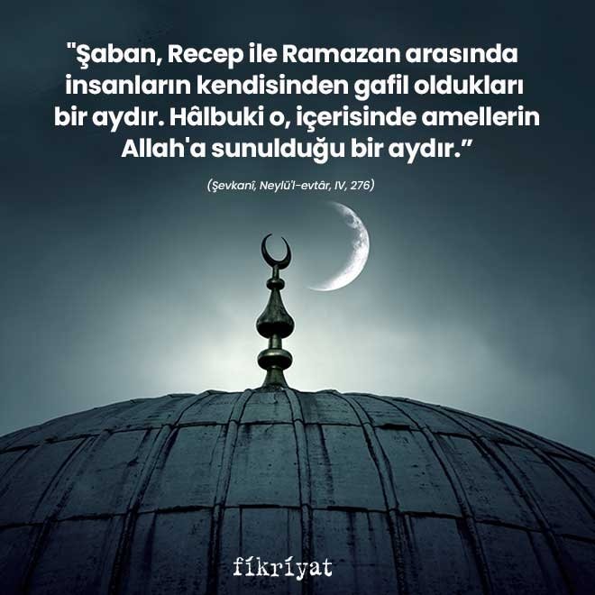 "Şaban, Recep ile Ramazan arasında insanların kendisinden gafil oldukları bir aydır. Hâlbuki o, içerisinde amellerin Allah'a sunulduğu bir aydır." (Şevkanî, Neylü'l-evtâr, IV, 276)