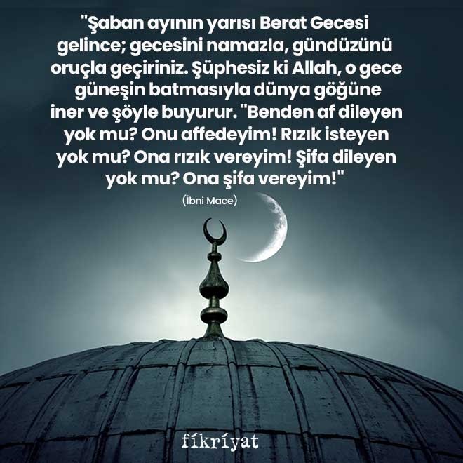 "Şaban ayının yarısı Berat Gecesi gelince; gecesini namazla, gündüzünü oruçla geçiriniz. Şüphesiz ki Allah, o gece güneşin batmasıyla dünya göğüne iner ve şöyle buyurur. "Benden af dileyen yok mu? Onu affedeyim! Rızık isteyen yok mu? Ona rızık vereyim! Şifa dileyen yok mu? Ona şifa vereyim!" (İbni Mace)