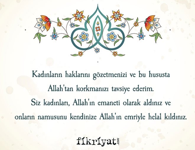 Kadınların haklarını gözetmenizi ve bu hususta Allah'tan korkmanızı tavsiye ederim. Siz kadınları, Allah'ın emaneti olarak aldınız ve onların namusunu kendinize Allah'ın emriyle helal kıldınız. Sizin kadınlar üzerinde hakkınız, kadınların da sizin üzerinizde hakkı vardır.