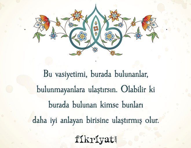 Sözümü iyi dinleyiniz ve iyi belleyiniz! Müslüman Müslüman'ın kardeşidir ve böylece bütün Müslümanlar kardeştirler. Bir Müslüman'a kardeşinin kanı da, malı da helal olmaz. Fakat malını gönül hoşluğu ile vermişse o başkadır.