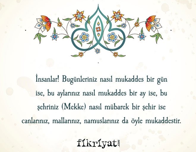 Sözümü iyi dinleyiniz! Bilmiyorum, belki bu seneden sonra sizinle burada bir daha buluşamayacağım. İnsanlar! Bugünleriniz nasıl mukaddes bir gün ise, bu aylarınız nasıl mukaddes bir ay ise, bu şehriniz (Mekke) nasıl mübarek bir şehir ise, canlarınız, mallarınız, namuslarınız da öyle mukaddestir, her türlü tecavüzden korunmuştur.