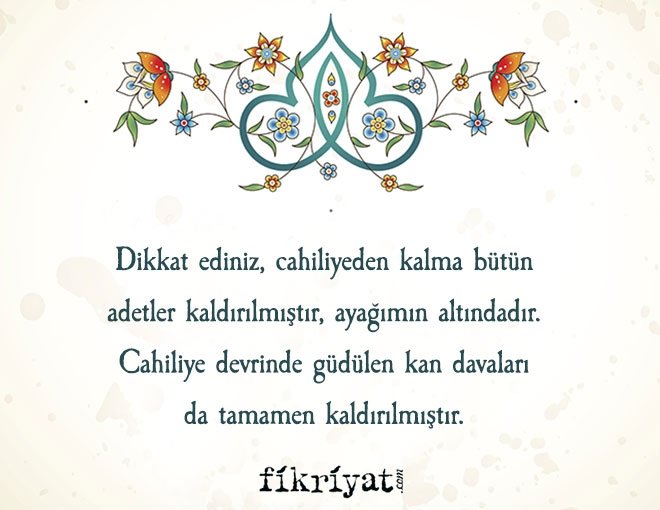 Dikkat ediniz, cahiliyeden kalma bütün adetler kaldırılmıştır, ayağımın altındadır. Cahiliye devrinde güdülen kan davaları da tamamen kaldırılmıştır. Kaldırdığım ilk kan davası Abdulmuttalib'in torunu Iyas bin Rabia'nın kan davasıdır.