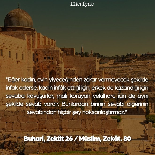 "Eğer kadın, evin yiyeceğinden zarar vermeyecek şekilde infak ederse, kadın infâk ettiği için, erkek de kazandığı için sevaba kavuşurlar, malı koruyan vekilharc için de aynı şekilde sevab vardır. Bunlardan birinin sevabı diğerinin sevabından hiçbir şey noksanlaştırmaz."