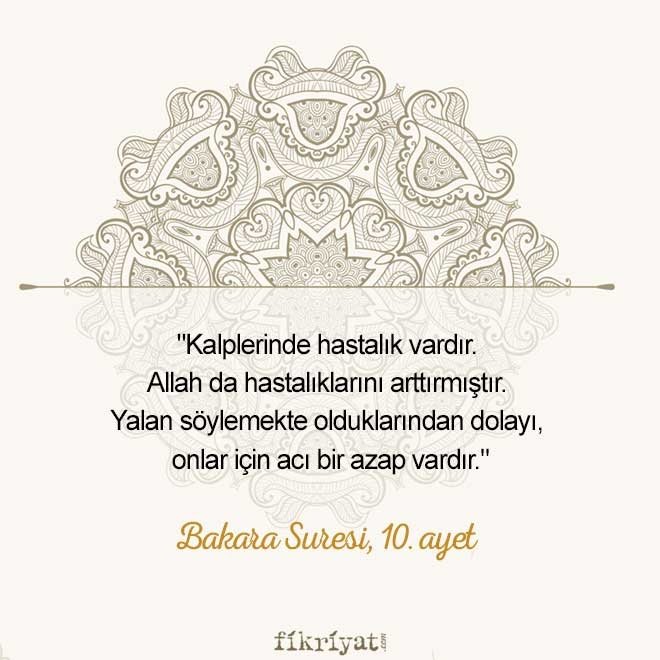 "Kalplerinde hastalık vardır. Allah da hastalıklarını arttırmıştır. Yalan söylemekte olduklarından dolayı, onlar için acı bir azap vardır."