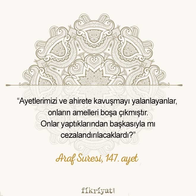 "Ayetlerimizi ve ahirete kavuşmayı yalanlayanlar, onların amelleri boşa çıkmıştır. Onlar yaptıklarından başkasıyla mı cezalandırılacaklardı?"