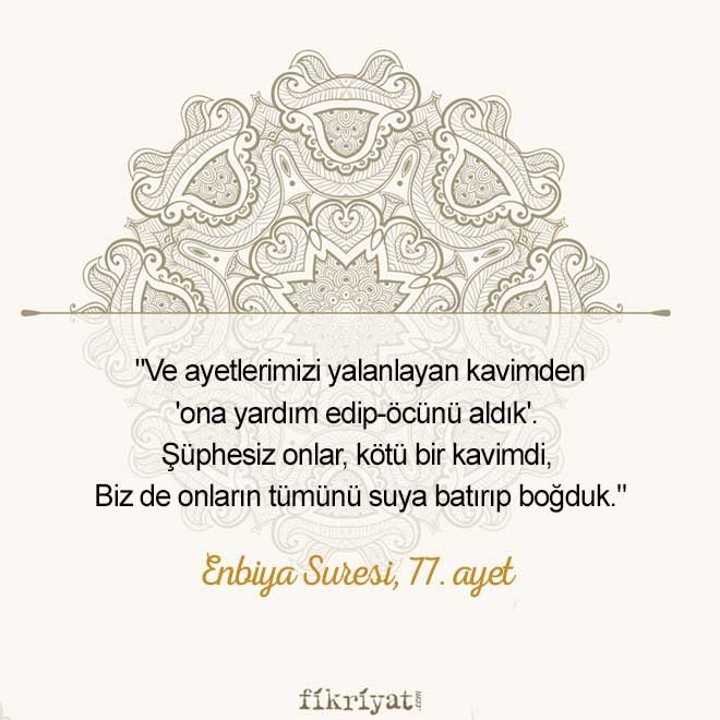 "Ve ayetlerimizi yalanlayan kavimden 'ona yardım edip-öcünü aldık'. Şüphesiz onlar, kötü bir kavimdi, Biz de onların tümünü suya batırıp boğduk."