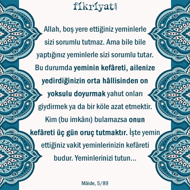 Allah, boş yere ettiğiniz yeminlerle sizi sorumlu tutmaz. Ama bile bile yaptığınız yeminlerle sizi sorumlu tutar. Bu durumda yeminin kefâreti, ailenize yedirdiğinizin orta hâllisinden on yoksulu doyurmak yahut onları giydirmek ya da bir köle azat etmektir. Kim (bu imkânı) bulamazsa onun kefâreti üç gün oruç tutmaktır. İşte yemin ettiğiniz vakit yeminlerinizin kefâreti budur. Yeminlerinizi tutun...