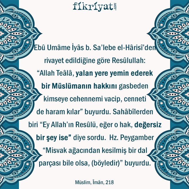 "Allah Teâlâ, yalan yere yemin ederek bir Müslümanın hakkını gasbeden kimseye cehennemi vacip, cenneti de haram kılar" buyurdu. Sahâbîlerden biri "Ey Allah'ın Resûlü, eğer o hak, değersiz bir şey ise" diye sordu. Hz. Peygamber "Misvak ağacından kesilmiş bir dal parçası bile olsa, (böyledir)" buyurdu.