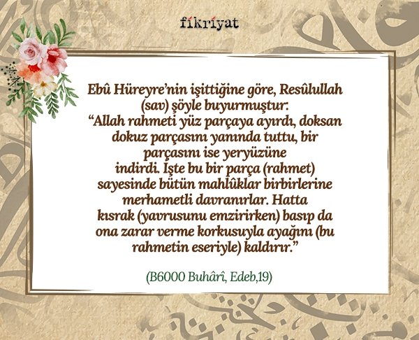 "Allah rahmeti yüz parçaya ayırdı, doksan dokuz parçasını yanında tuttu, bir parçasını ise yeryüzüne indirdi. İşte bu bir parça (rahmet) sayesinde bütün mahlûklar birbirlerine merhametli davranırlar. Hatta kısrak (yavrusunu emzirirken) basıp da ona zarar verme korkusuyla ayağını (bu rahmetin eseriyle) kaldırır."