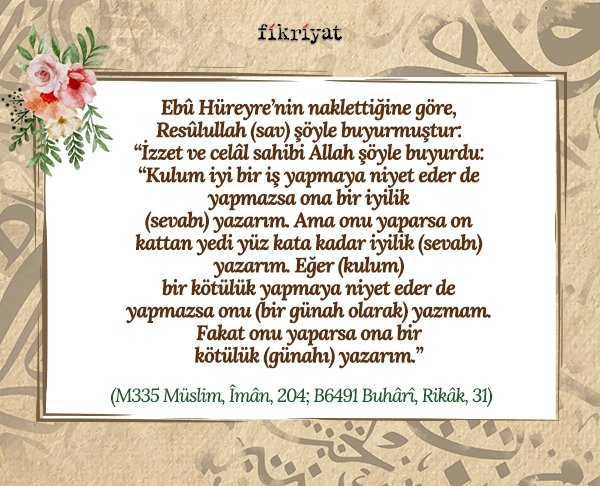 "İzzet ve celâl sahibi Allah şöyle buyurdu: "Kulum iyi bir iş yapmaya niyet eder de yapmazsa ona bir iyilik (sevabı) yazarım. Ama onu yaparsa on kattan yedi yüz kata kadar iyilik (sevabı) yazarım. Eğer (kulum) bir kötülük yapmaya niyet eder de yapmazsa onu (bir günah olarak) yazmam. Fakat onu yaparsa ona bir kötülük (günahı) yazarım."