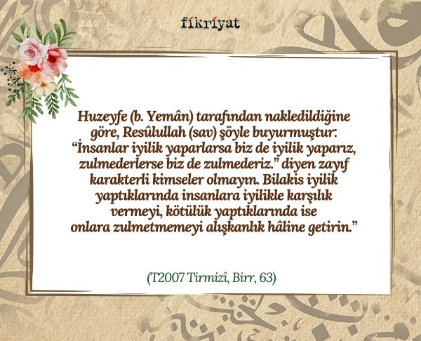 "İnsanlar iyilik yaparlarsa biz de iyilik yaparız, zulmederlerse biz de zulmederiz." diyen zayıf karakterli kimseler olmayın. Bilakis iyilik yaptıklarında insanlara iyilikle karşılık vermeyi, kötülük yaptıklarında ise onlara zulmetmemeyi alışkanlık hâline getirin."