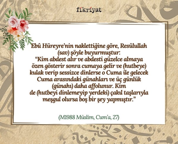 "Kim abdest alır ve abdesti güzelce almaya özen gösterir sonra cumaya gelir ve (hutbeye) kulak verip sessizce dinlerse o Cuma ile gelecek Cuma arasındaki günahları ve üç günlük (günahı) daha affolunur. Kim de (hutbeyi dinlemeyip yerdeki) çakıl taşlarıyla meşgul olursa boş bir şey yapmıştır."