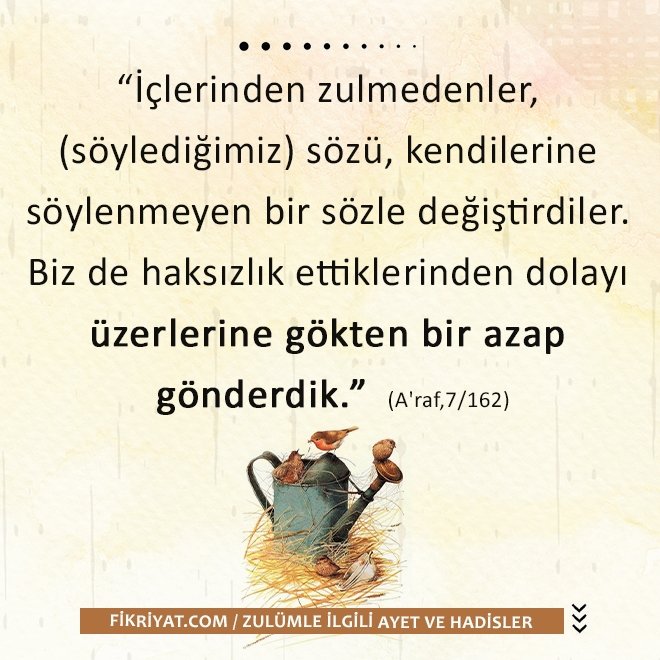 ◾ "İçlerinden zulmedenler, (söylediğimiz) sözü, kendilerine söylenmeyen bir sözle değiştirdiler. Biz de haksızlık ettiklerinden dolayı üzerlerine gökten bir azap gönderdik."