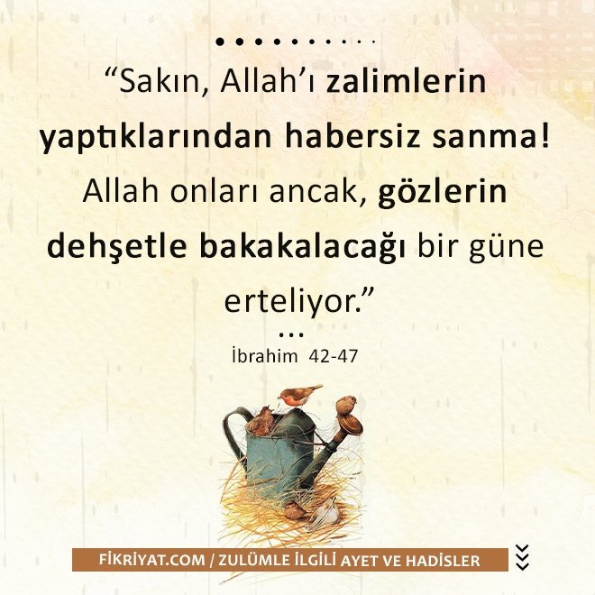 ◾ "Sakın, Allah'ı zalimlerin yaptıklarından habersiz sanma! Allah onları ancak, gözlerin dehşetle bakakalacağı bir güne erteliyor O gün başlarını dikerek (çağırıldıkları yere doğru) koşarlar. Gözleri kendilerine bile dönmez, kalpleri de bomboştur. (Ey Muhammed!) İnsanları, kendilerine azabın geleceği gün ile uyar. Zira o gün zalimler, "Ey Rabbimiz! Yakın bir süreye kadar bizi ertele de senin çağrına uyalım ve peygamberlerin izinden gidelim" diyecekler. Onlara şöyle denilecek: "Daha önce siz, sonunuzun gelmeyeceğine yemin etmemiş miydiniz?" "Kendilerine zulmedenlerin yerlerinde oturdunuz. Onlara ne yaptığımız ise size belli olmuştu. Size misaller de vermiştik." Onlar gerçekten tuzaklarını kurmuşlardı. Tuzakları yüzünden dağlar yerinden oynayacak olsa bile, tuzakları Allah katındadır (Allah onu bilir). Sakın Allah'ın, peygamberlerine verdiği sözden cayacağını sanma! Şüphesiz Allah mutlak güç sahibidir, intikam sahibidir."