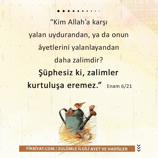 ◾ "Kim Allah'a karşı yalan uydurandan, ya da onun âyetlerini yalanlayandan daha zalimdir? Şüphesiz ki, zalimler kurtuluşa eremez."