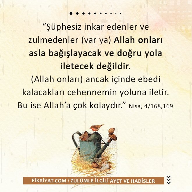 ◾ "Şüphesiz inkar edenler ve zulmedenler (var ya) Allah onları asla bağışlayacak ve doğru yola iletecek değildir. (Allah onları) ancak içinde ebedi kalacakları cehennemin yoluna iletir. Bu ise Allah'a çok kolaydır."