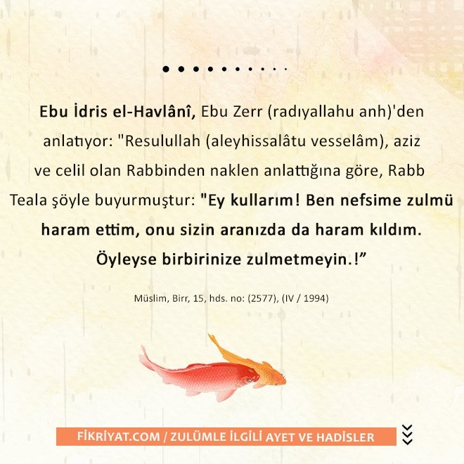 ◾ Ebu İdris el-Havlânî, Ebu Zerr (radıyallahu anh)'den anlatıyor: "Resulullah (aleyhissalâtu vesselâm), aziz ve celil olan Rabbinden naklen anlattığına göre, Rabb Teala şöyle buyurmuştur:"Ey kullarım! Ben nefsime zulmü haram ettim, onu sizin aranızda da haram kıldım. Öyleyse birbirinize zulmetmeyin.!"