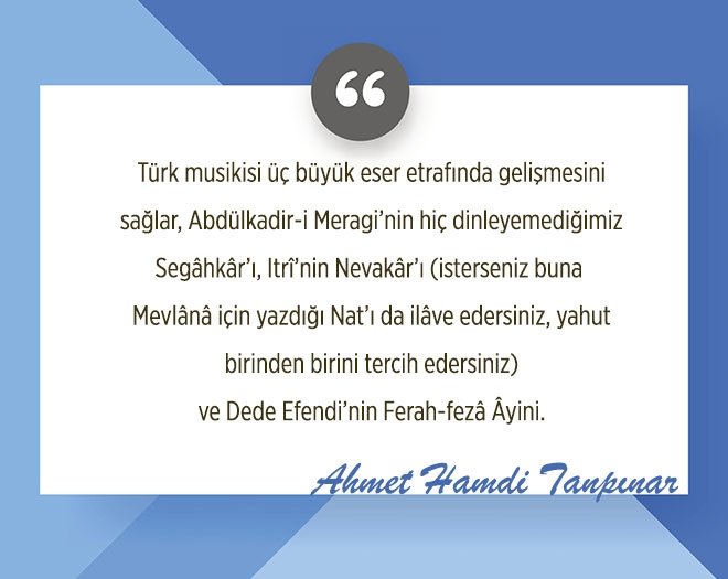 İnsan ruhunu zenginleştirecek eserler kaleme alan Ahmet Hamdi Tanpınar'ın sanatının ve estetiğinin oluşumunda musikinin çok önemli, işlevsel bir rolü vardı. Onun eserlerinin anahtar kavramlarından biri olan musiki, bir çağrışım aracıydı. Tanpınar romanlarında bir olayı veya durumu betimlemek yerine besteye atıfta bulunurdu. Ahmet Hamdi Tanpınar'ın satır aralarında yer alan müzikleri sizler için derledik.