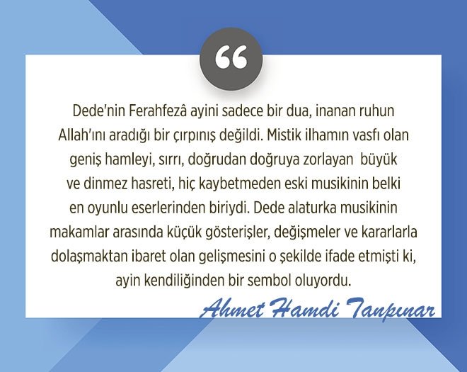 Dede'nin Ferahfezâ ayini sadece bir dua, inanan ruhun Allah'ını aradığı bir çırpınış değildi. Mistik ilhamın vasfı olan geniş hamleyi, sırrı, doğrudan doğruya zorlayan büyük ve dinmez hasreti, hiç kaybetmeden eski musikinin belki en oyunlu eserlerinden biriydi. Dede alaturka musikinin makamlar arasında küçük gösterişler, değişmeler ve kararlarla dolaşmaktan ibaret olan gelişmesini o şekilde ifade etmişti ki, ayin kendiliğinden bir sembol oluyordu."