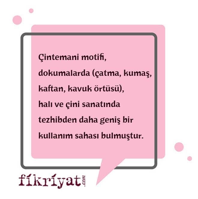 Tezhib, çini, kalem işi, cilt gibi sanat kollarında kullanılan çintemani motifi, Osmanlı sanat kollarında kullanılan çintemani motifi, Osmanlı sanatında TSMK, EH. 1512'deki 921/1515 tarihli Mantıku't-Tayr adlı yazma eserin sahife kenarlarında görülmektedir. Bu motife, Yavuz Sultan Selim'im Tebriz'i alıp (1514) oradaki sanatkârları İstanbul'a getirmesinden sonra rastlanmaktadır.