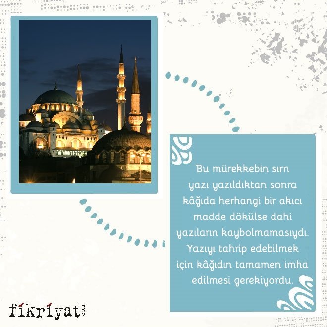 Mimar Sinan'ın, hava akımını is odası yönüne ayarlayabilmek amacıyla, camiyi is odası merkezli tasarladı. Odada biriken isle de, mürekkep elde edildi. Bu mürekkeple o günün siyasi, dini ve idari bütün fermanları yazıldı. Bu mürekkebin sırrı ise, yazı yazıldıktan sonra kâğıda herhangi bir akıcı madde dökülse dahi yazıların kaybolmamasıydı. Yazıyı tahrip edebilmek için kâğıdın tamamen imha edilmesi gerekiyordu. Bu nedenle bütün önemli belgelerde, Sinan'ın keşfi olan bu mürekkep kullanıldı.