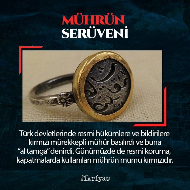 🔴 Türk devletlerinde resmi hükümlere ve bildirilere kırmızı mürekkepli mühür basılırdı ve buna "al tamga" denirdi. Günümüzde de resmi koruma, kapatmalarda kullanılan mührün mumu kırmızıdır.