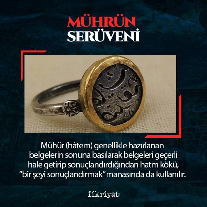 🔴 Mühür (hâtem) genellikle hazırlanan belgelerin sonuna basılarak belgeleri geçerli hale getirip sonuçlandırdığından "hatm" kökü "bir şeyi sonuçlandırmak, bitirmek" manasında da kullanılır.