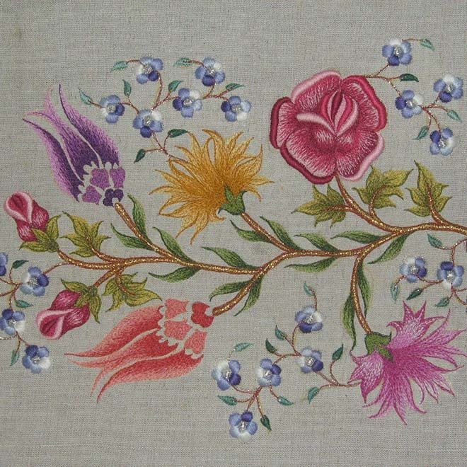 🔘 18. yüzyılda metal iplik kullanılmaya başlandı ve nakışa mimari detay girdi. (Görkemli binalar, bahçeler...) Nakış dokumadan ayrılır. Çin iğnesi tarzı doğar. Suzeni zincir işi de bu sırada nakış türleri arasına girer.