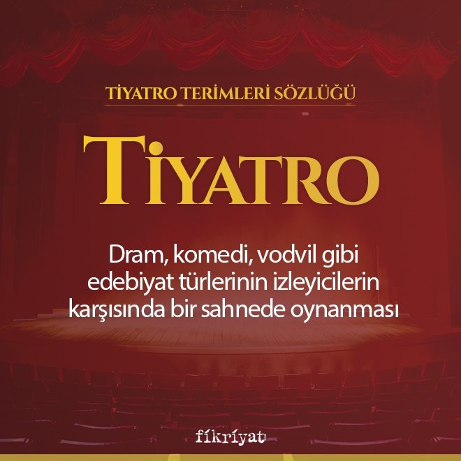 🔸 Dramatik metin, oyuncu, sahne tasarımı, kostüm, sahne tekniği, sahneleme gibi ögelerden oluşan tiyatro Yunanca "theatron" yani "görme yeri" sözcüğünden gelir. Türkçeye ise İtalyanca "teatro" sözcüğünden geçmiştir.