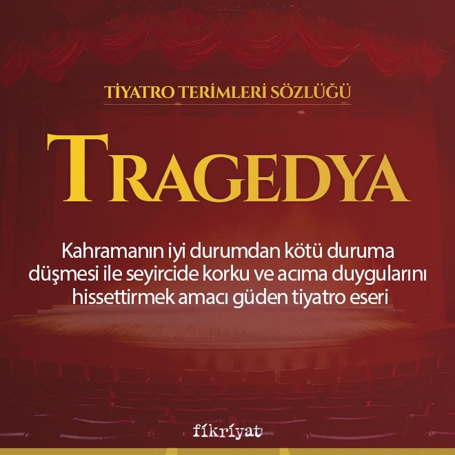 🔸 TRAGEDYA: Kahramanın iyi durumdan kötü duruma düşmesiyle seyircide korku ve acıma duygularını hissettirmek amacıyla yazılan tiyatro eseridir.