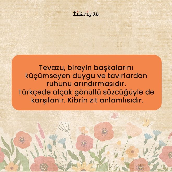 🔸 Tevazu sahibi olmak elbette "her şeyi hoş görmek demek" değildir. Mütevazı insan, haklarını korumalıdır. Haksızlık karşısında durmalı, düşüncelerini söylemelidir. Çünkü haksızlık karşısında susan, dilsiz şeytandır.