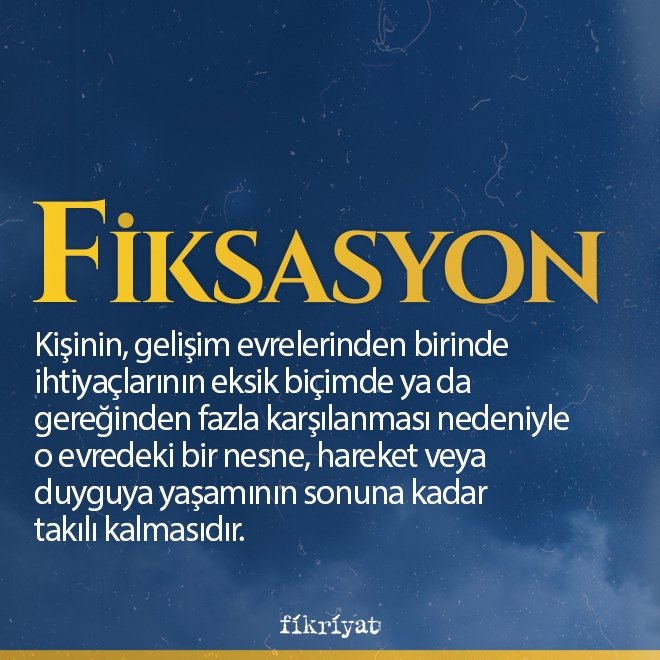 🔹 Kişinin, gelişim evrelerinden birinde ihtiyaçlarının eksik biçimde ya da gereğinden fazla karşılanması nedeniyle o evredeki bir nesne, hareket veya duyguya yaşamının sonuna kadar takılı kalmasıdır. Psikanalitik kuramda, aşırı savurganlık, cimrilik, dağınıklık, dürtüsellik ve mükemmelliyetçilik de fiksasyon ile ilişkilendirilir.