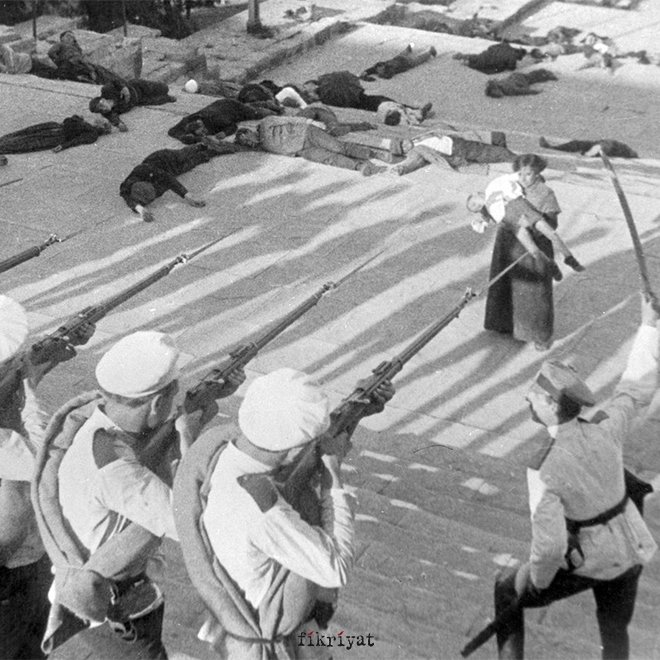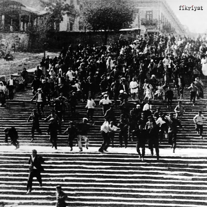 ◼ Sahnede, çarlık rejimi askerleri ellerindeki silahlarla merdivenlerden inerek, insanlara ateş açar. O an halk panikle merdivenden inmeye, sağa sola kaçışmaya başlar.