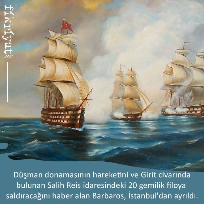 📌 Düşman donamasının hareketini ve Girit civarında bulunan Salih Reis idaresindeki 20 gemilik filoya saldıracağını haber alan Barbaros Hayreddin Paşa, İstanbul'dan ayrıldı.