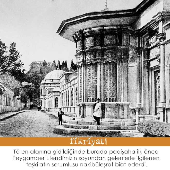 📌 Tören alanına gidildiğinde padişaha ilk önce Peygamber Efendimizin soyundan gelenlerle ilgilenen teşkilatın sorumlusu nakibüleşraf biat ederdi. Sonrasında herkes teşrifattaki sırasına göre gelip biat ederlerdi.