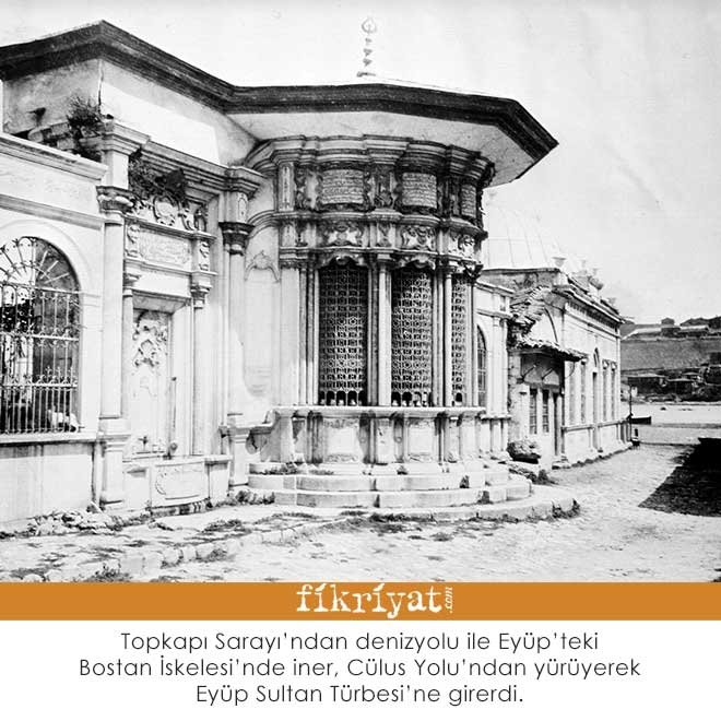 📌 Osmanlı yönetim geleneklerine göre sultan, ekseriyetle Topkapı Sarayı'ndan denizyolu ile Eyüp'teki Bostan İskelesi'nde iner, Cülus Yolu'ndan yürüyerek Eyüp Sultan Türbesi'ne girerdi. Burada kılıç kuşanırdı.