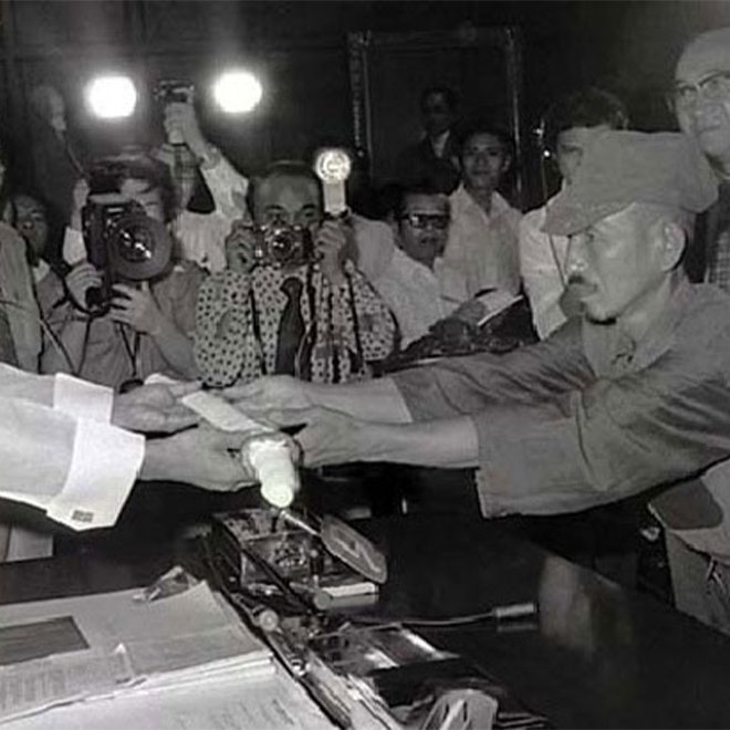 ◼ 9 Mart 1974 yılında, üstü başı paramparça olan Onoda, Taniguchi'yi tanır tanımaz selama durdu: "Teğmen Onoda göreve hazır, komutanım." Arisaka'99 model Japon tüfeğini ve geriye yalnızca 500 adet kalan mermisiyle birkaç el bombasını komutan Taniguchi'ye teslim etti. 10 mart 1974'te Binbaşı Yoşimi Taniguchi'nin Teğmen Onoda'ya verdiği emirle İkinci Dünya Savaşı Onoda için resmen sona ermiş oldu.