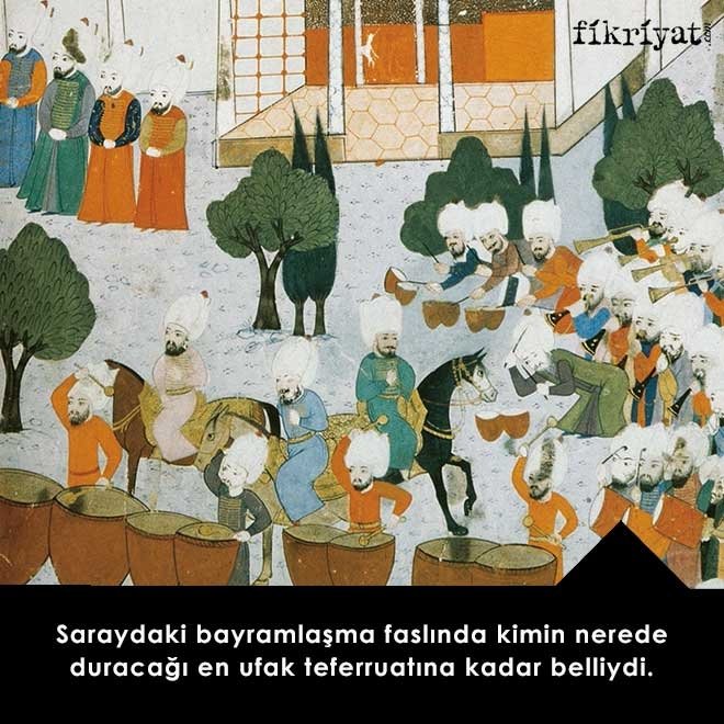 💠 Saraydaki bayramlaşma faslında kimin nerede duracağı en ufak teferruatına kadar belliydi. Örneğin padişahın oturduğu tahtın arkasında sağda Darüssaade ağası, solda da silahdar bulunurdu. Buradaki tören sırasında mehter durmadan çalardı.