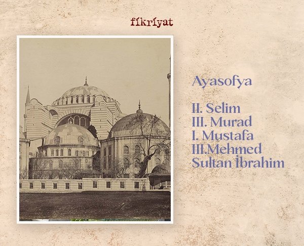 ◾ Bu hususiyet tam beş Osmanlı padişahının naaşının Ayasofya'ya defnedilmesine sebep oldu. Bunlar II. Selim, III. Murad, I. Mustafa, III. Mehmed ve Sultan İbrahim idi.