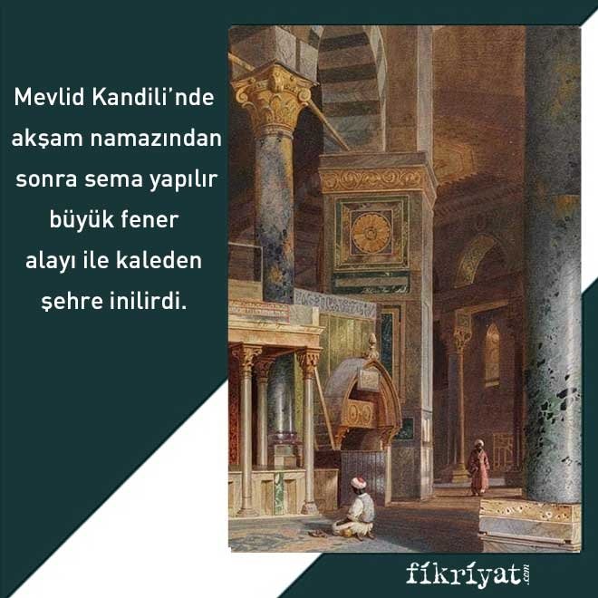 📌 Mevlid Kandili'nde akşam namazından sonra sema yapılır büyük fener alayı ile kaleden şehre inilirdi. Vaazlar verilir, sufiler elleriyle halka giyecek dağıtırdı. Törene katılanlara yemekler ikram edilirdi.