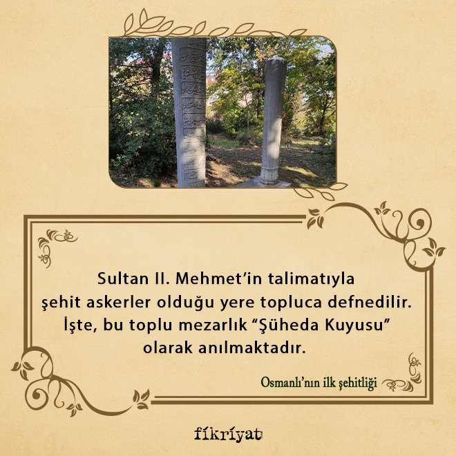 ◼ Miladi 1453'te Sultan II. Mehmed'in emriyle akıncı ve serdengeçtilerden oluşan Osmanlı'nın öncü kuvvetlerinden bir grup asker, inşa aşamasındaki Rumeli Hisarı'na paralel olarak uzanan Bizans'ın içlerine doğru ilerlemeye başlar. Ancak bu askerlerin bir kısmı Rumeli Hisarı'nın üst taraflarında şehit düşer.