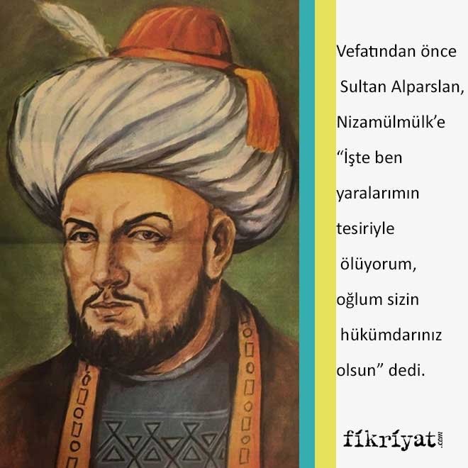 📌 Vefatından önce Sultan Alparslan, Nizamülmülk'e "İşte ben yaralarımın tesiriyle ölüyorum, oğlum sizin hükümdarınız olsun" dedi. Çevresindekilerin Melikşah'a biat etmesini istedi ve bu yönde söz aldı. Devletin geleceğiyle ilgili tavsiyelerde bulunduktan sonra son eşinin, kardeşi Kirman Meliki Kavurd'la evlendirilmesini istedi. Bu sayede Kavurd'un isyan etmesini engellemeyi düşünüyordu.